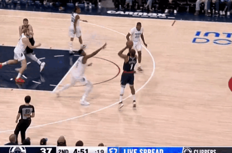 次节还剩4分钟哈登追身三分命中,取得本场首记运动战进球