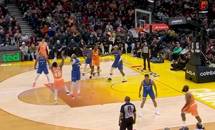 杜兰特突破上篮被麦丹按着肩部封盖,裁判未进行任何吹罚