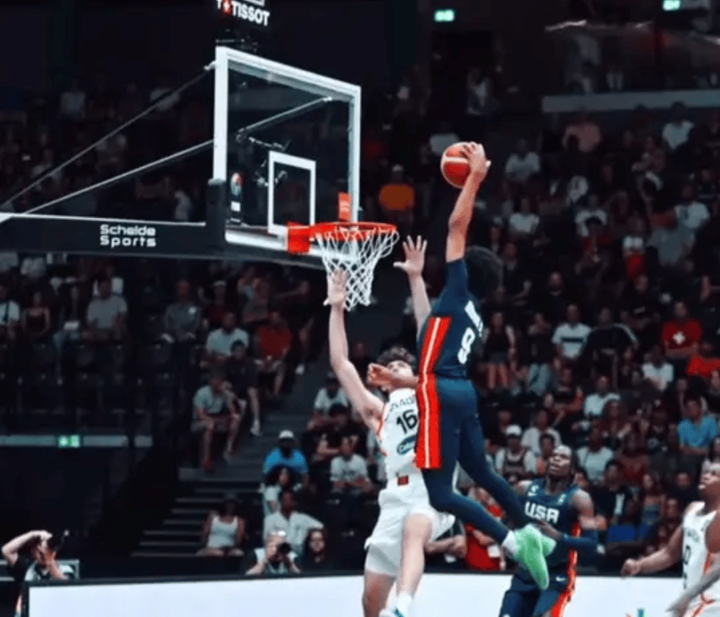FIBA社媒分享赛场精彩瞬间:小米克尔-布朗隔扣比自己高17cm的内线