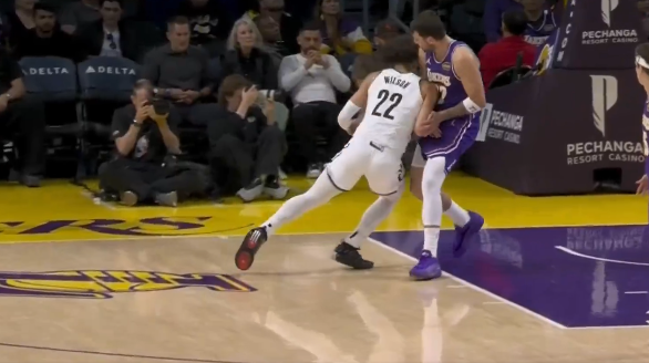 东契奇被威尔逊顶到腹部倒地,随后撤步三分投进砍下41分