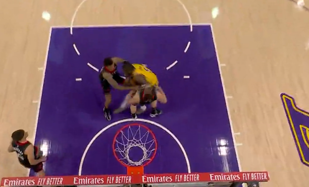 詹姆斯身后追防大帽阿门,已经拿6分2篮板10助攻1抢断1盖帽