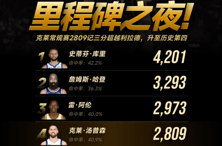 里程碑!克莱常规赛2809记三分超利拉德,升至历史第四