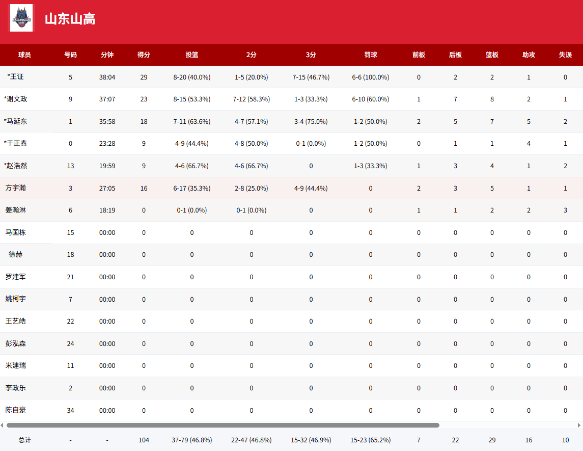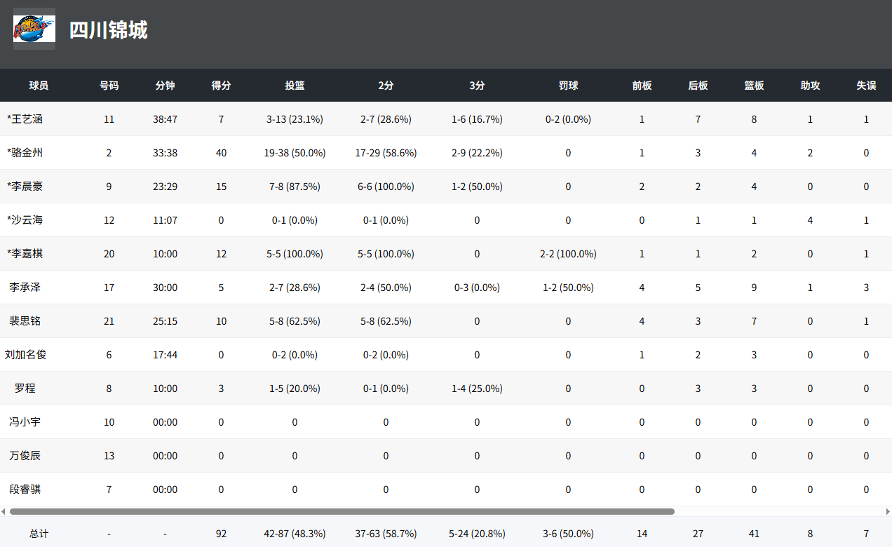 卢峻翔全场出战33分钟,15中5得到19分4板1助攻2抢断