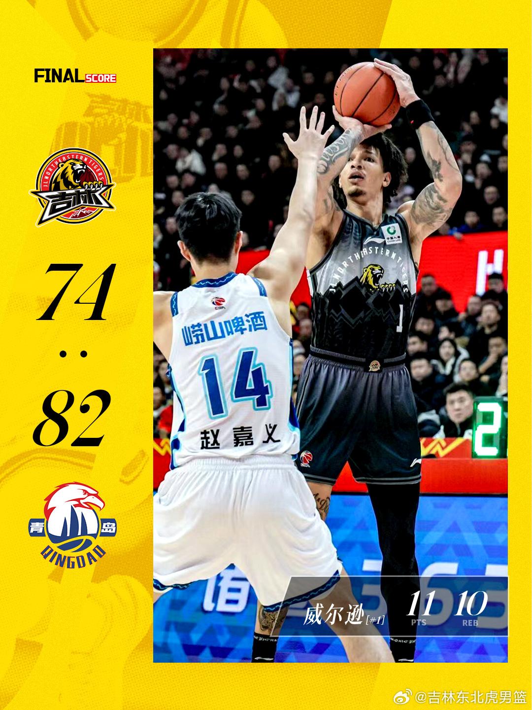 吉林男篮分享本场比赛海报:球队74-82负于青岛