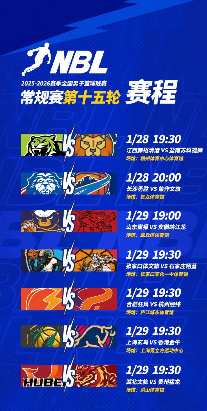 NBL常规赛第十五轮今日赛程:上海玄鸟对阵香港金牛