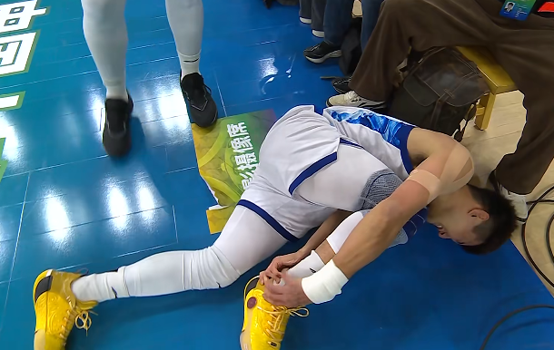 孙铭徽突破崴脚扭伤倒地表情痛苦,随后被队友背回更衣室