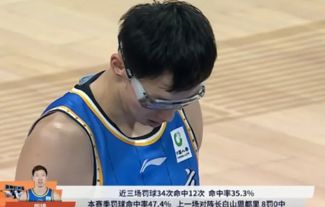 周琦上一场比赛罚球8中0,本场对阵浙江队罚球7中6