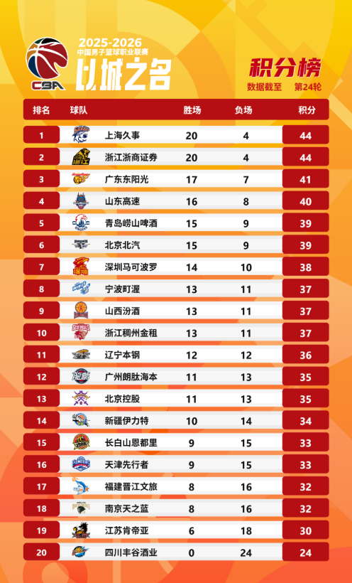 CBA更新第24轮积分榜:上海升至第一,广厦&广东分列二三