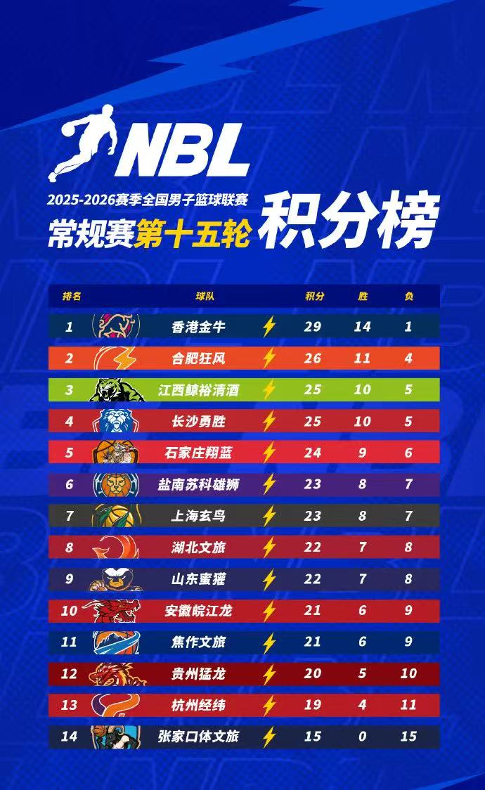 NBL分享常规赛第15轮最新积分榜:香港金牛首败终止14连胜