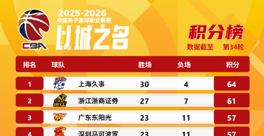 CBA常规赛第34轮积分榜:上海榜首领先广厦3胜场,四川全败