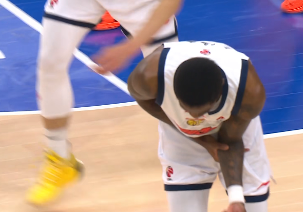 萨姆纳突破过掩护时左手被夹住受伤,随后表情痛苦被换下场