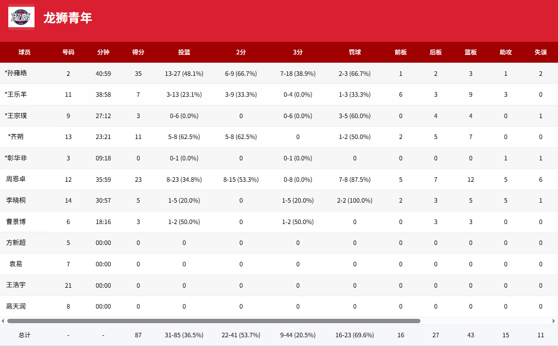 U19全国赛:孙雍皓35分,龙狮青年队87-84战胜新疆