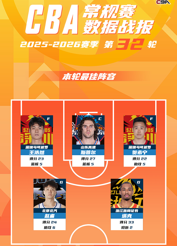 CBA常规赛第32轮最佳阵容:赵睿、王浩然、贺希宁领衔
