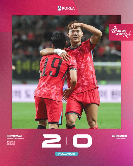 韩国2-0巴拉圭,严智星、吴贤揆破门,李刚仁送助攻