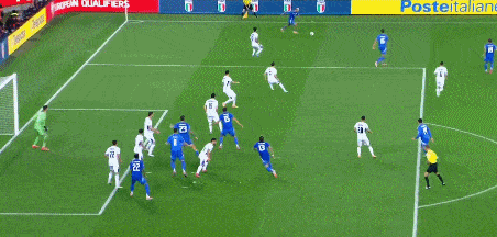意大利右路传中,小曼奇尼头球破门,意大利3-0