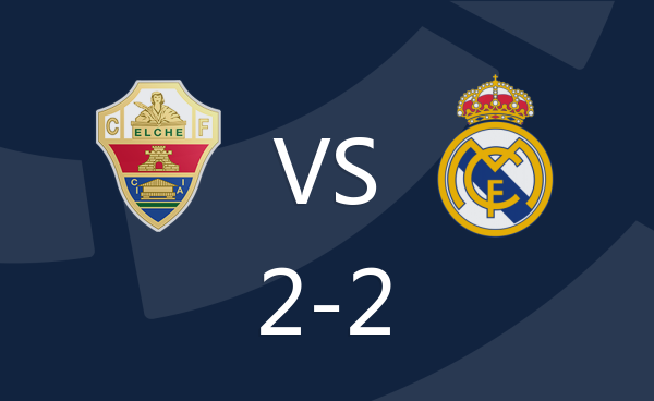 埃尔切2-2皇马全场数据:射门15-20,射正6-7,良机2-6