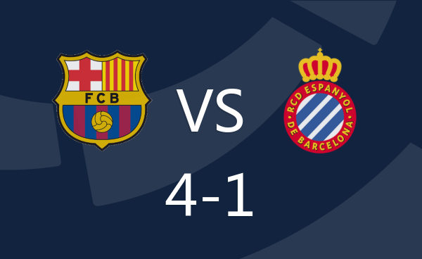 巴萨4-1西班牙人全场数据:射门20-10,射正10-2,良机4-1