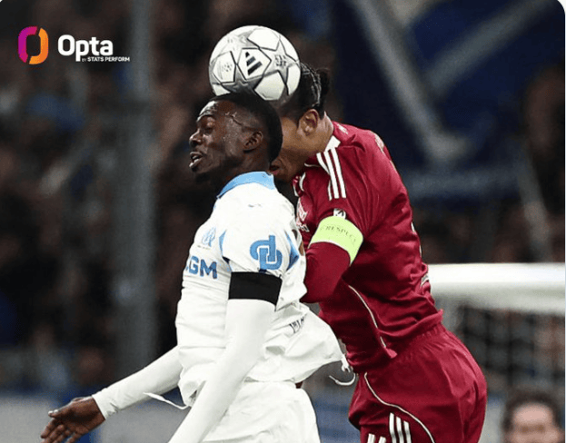 范戴克本赛季欧冠赢得28次空中对抗中的24次,所有球员最多
