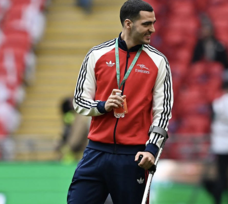 拄拐观战决赛,梅里诺穿保护靴+手臂绑着拐杖现身温布利