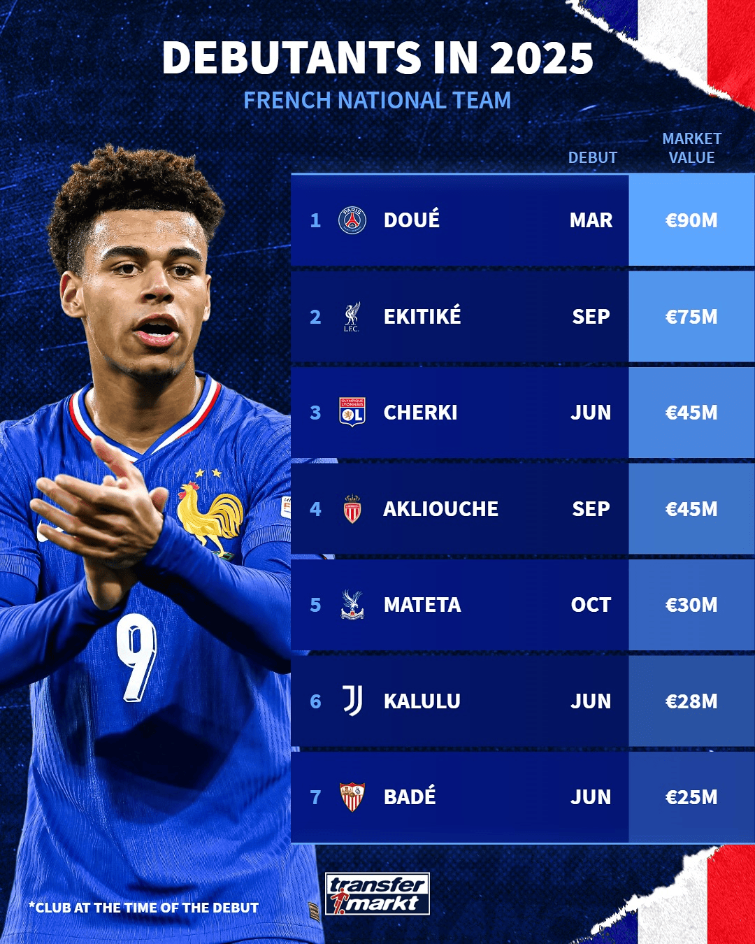2025年法国国家队新人身价榜:杜埃9000万,埃基蒂克7500万