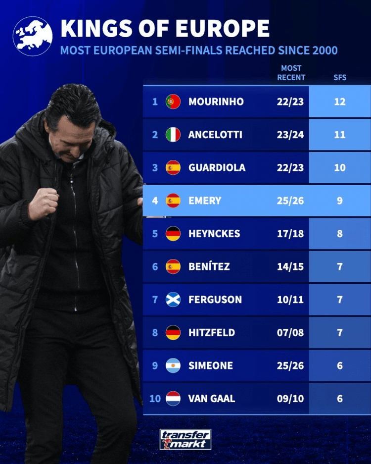 冲击个人第五座欧联冠军,埃梅里第七次晋级欧联半决赛