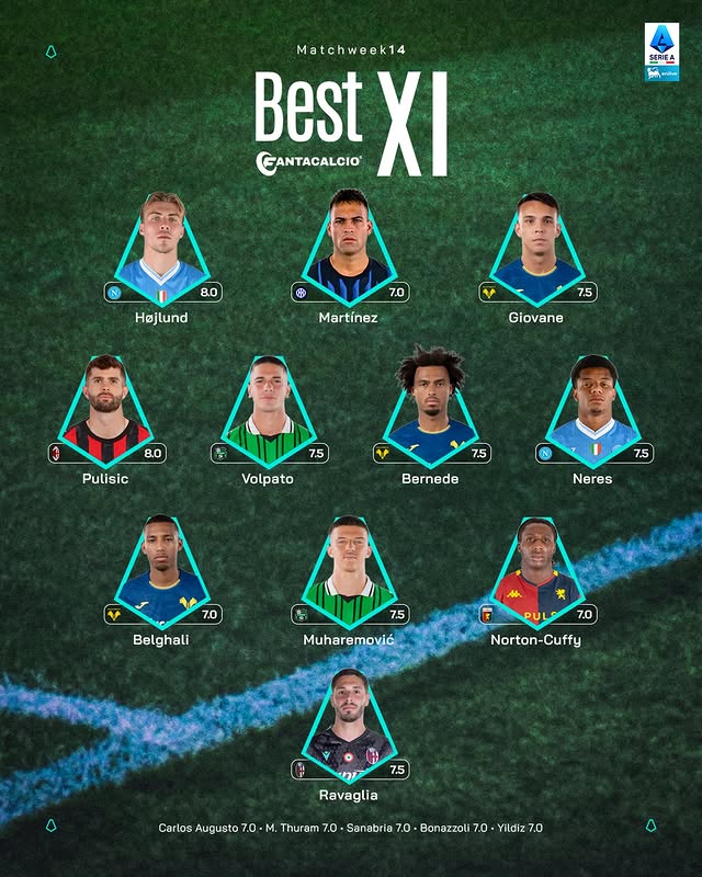 意甲官方第14轮最佳阵容:劳塔罗、普利西奇、霍伊伦入选