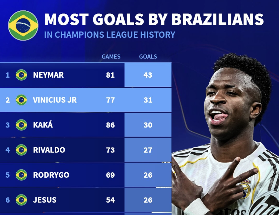 巴西球员欧冠射手榜:内马尔43球居首;维尼修斯31球第二