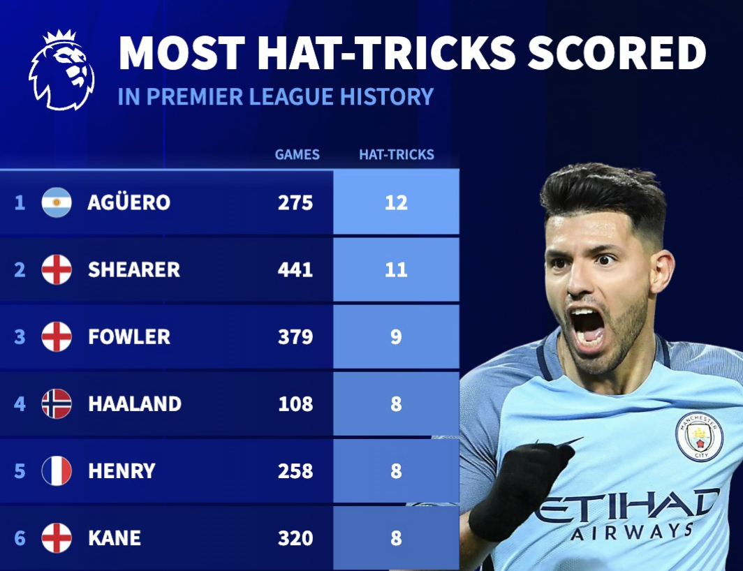 英超历史戴帽榜:阿圭罗275场12次居首;哈兰德已8次排第四