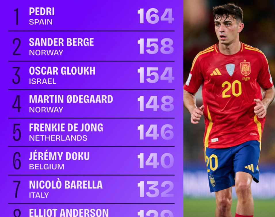 佩德里在本届世欧预进攻三区完成164次传球,所有球员里最多