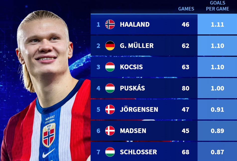 场均1.11球!哈兰德是足坛历史在国家队进球效率最高的球员