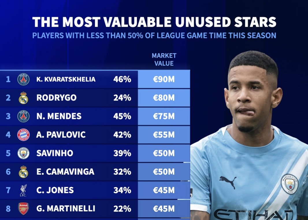 本季上场时间不足半成球员身价榜:K77与罗德里戈分居前二