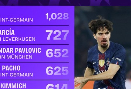 本赛季欧冠传球榜:维蒂尼亚1028次遥遥领先,加西亚第二