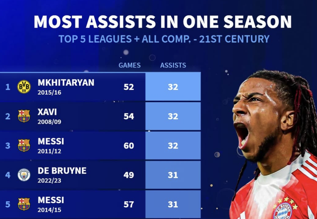 五大联赛21世纪单赛季助攻榜:梅西32次并列居首,奥利塞第7