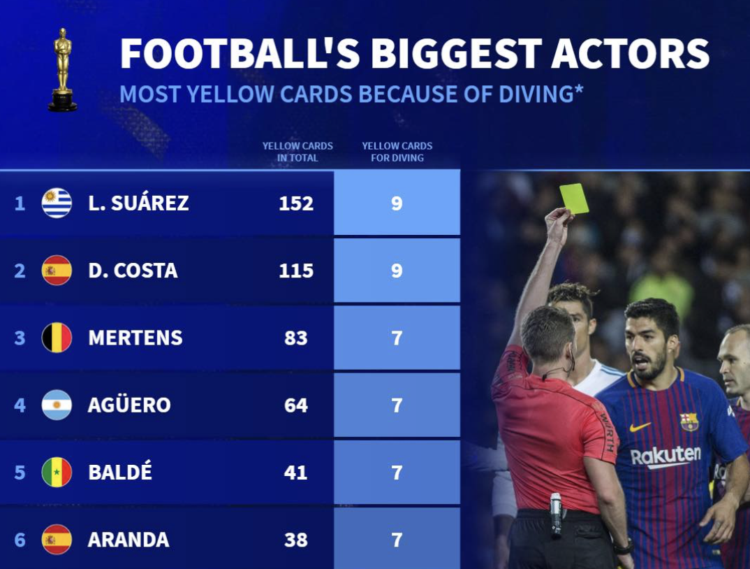 因假摔黄牌次数榜:苏亚雷斯和迭戈-科斯塔各9次,并列第一