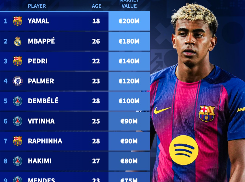 FIFA年度最佳候选身价排行:亚马尔2亿欧居首,姆巴佩第二