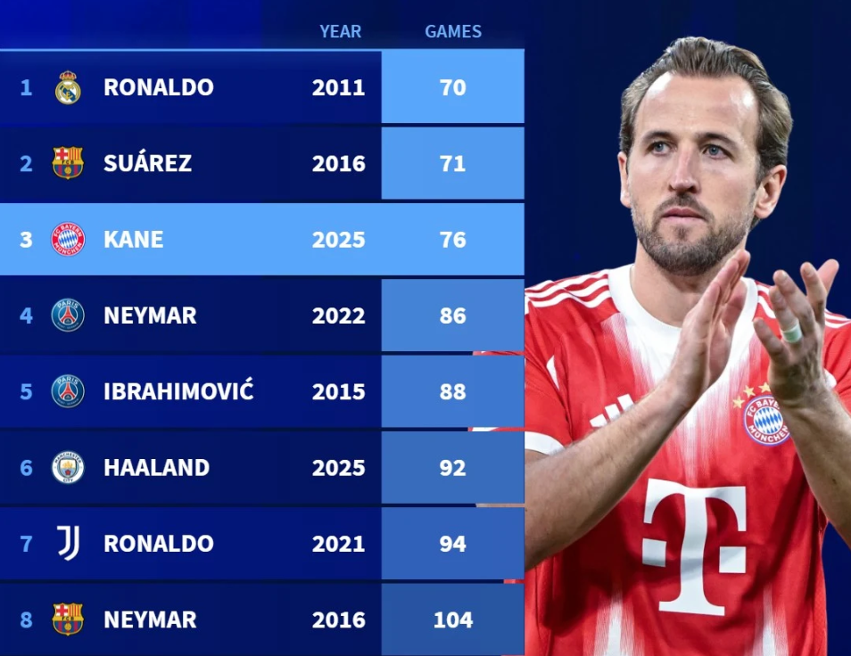 本世纪五大联赛最快参与100球的球员:C罗70场居首,凯恩前3