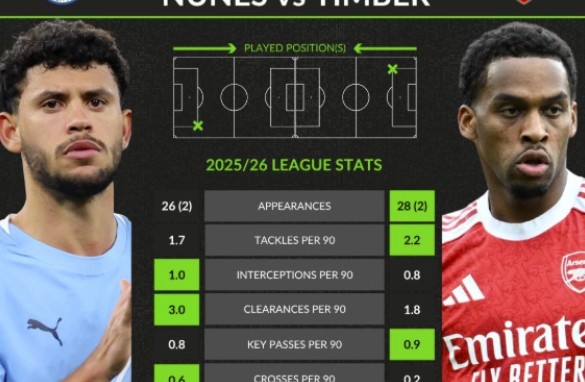 努内斯、廷贝尔本赛季英超每90分钟数据对比:抢断1.7—2.2