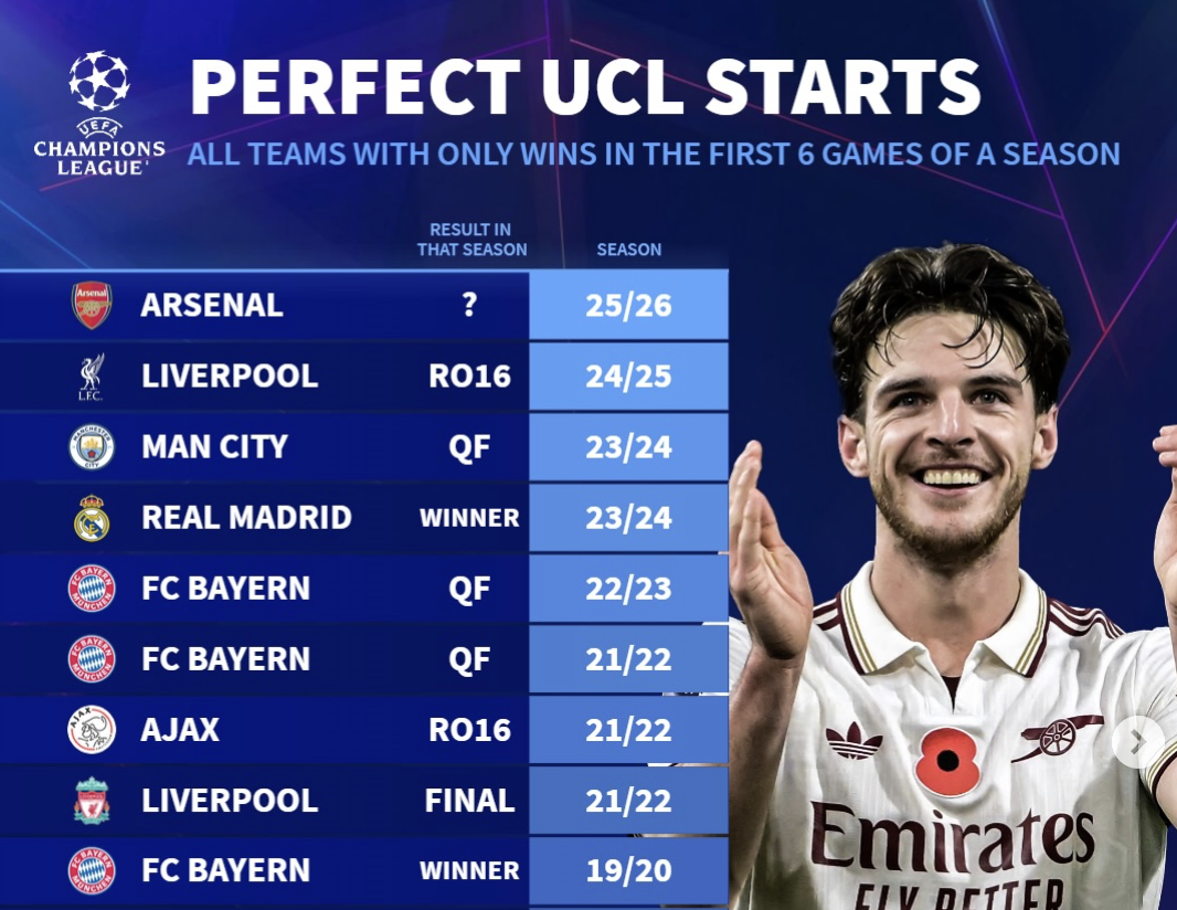 欧冠史上赛季前六战全胜球队战绩:仅皇马和拜仁曾最终夺冠