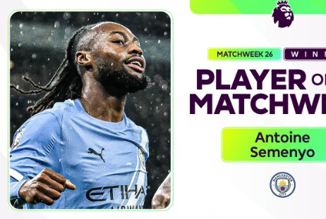 传射建功,英超官方:塞梅尼奥当选联赛第26轮最佳球员