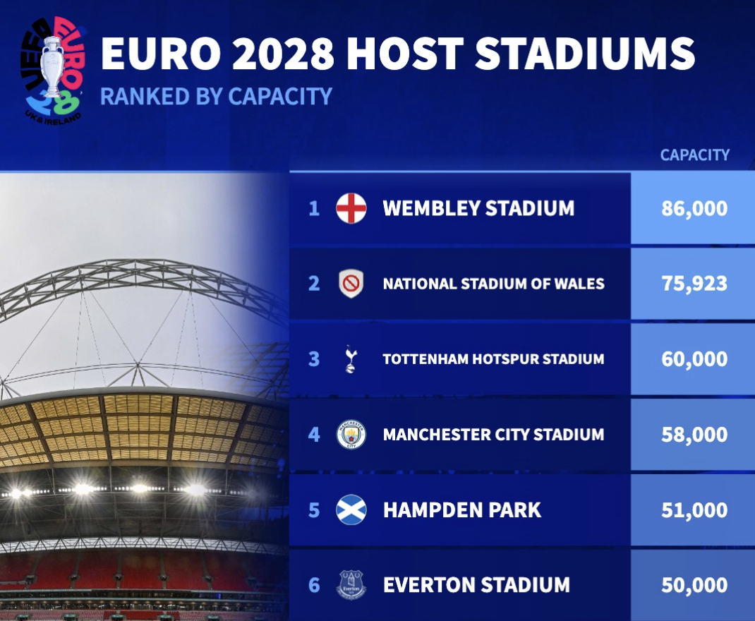 2028年欧洲杯场馆容量榜:温布利球场86000个席位居首