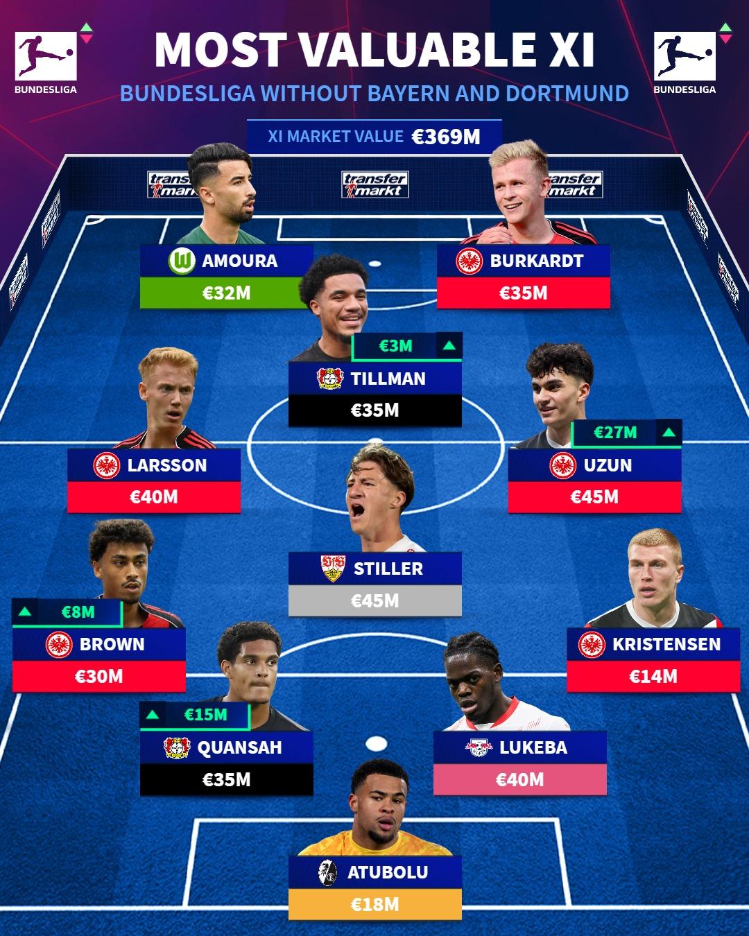 德甲除拜仁、多特球员身价最高阵容:乌尊领衔法鹰5人在列