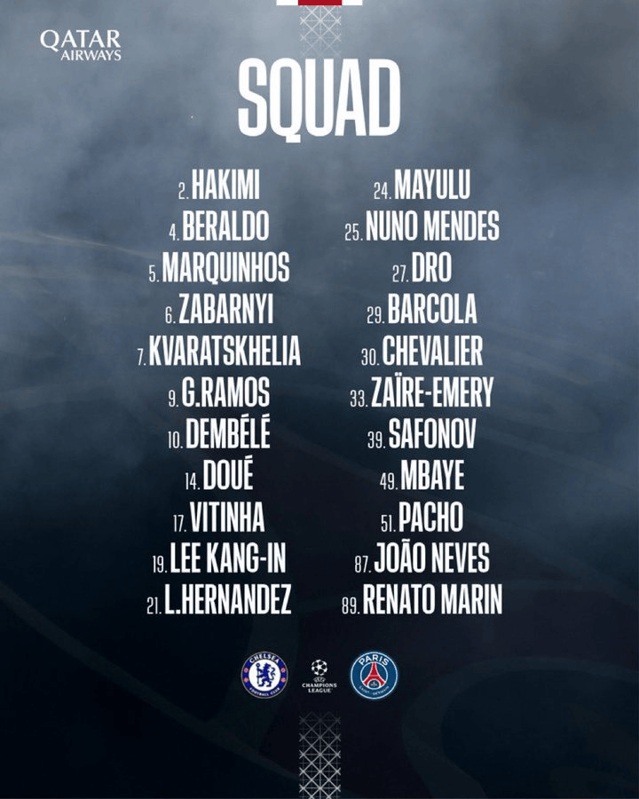 巴黎vs切尔西大名单:登贝莱领衔;仅鲁伊斯一位伤员缺席