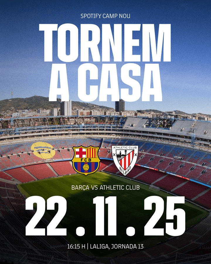 回家!巴萨官方:11月22日与毕尔巴鄂的比赛将于诺坎普进行