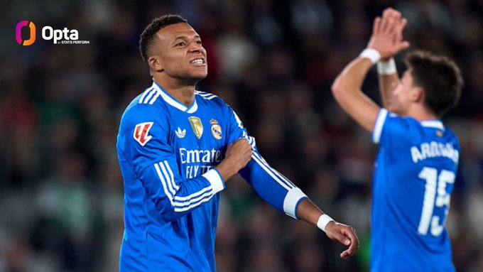 姆巴佩近2场西甲均未能取得进球,为其本赛季西甲最长进球荒