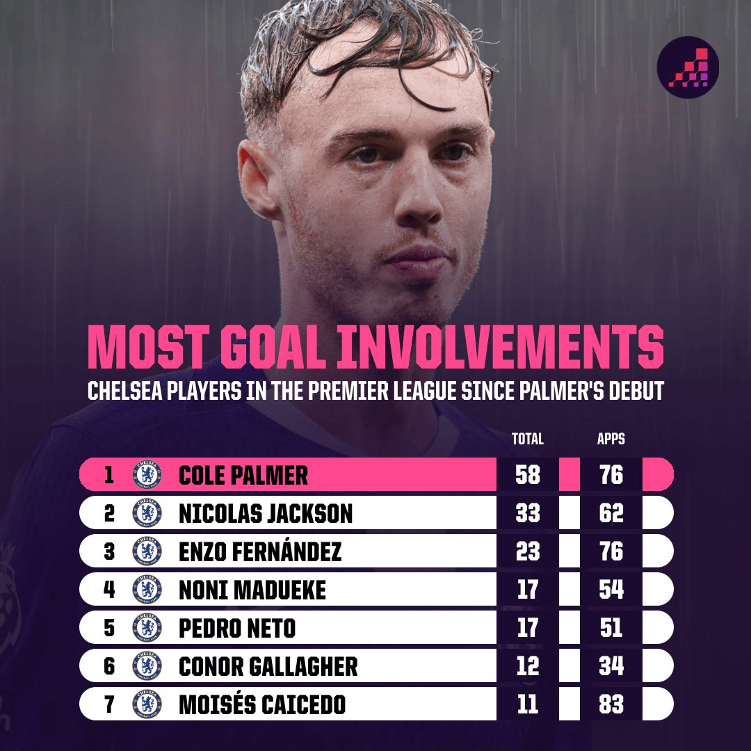 帕尔默切尔西首秀以来联赛参与58球,同期第二名杰克逊33球