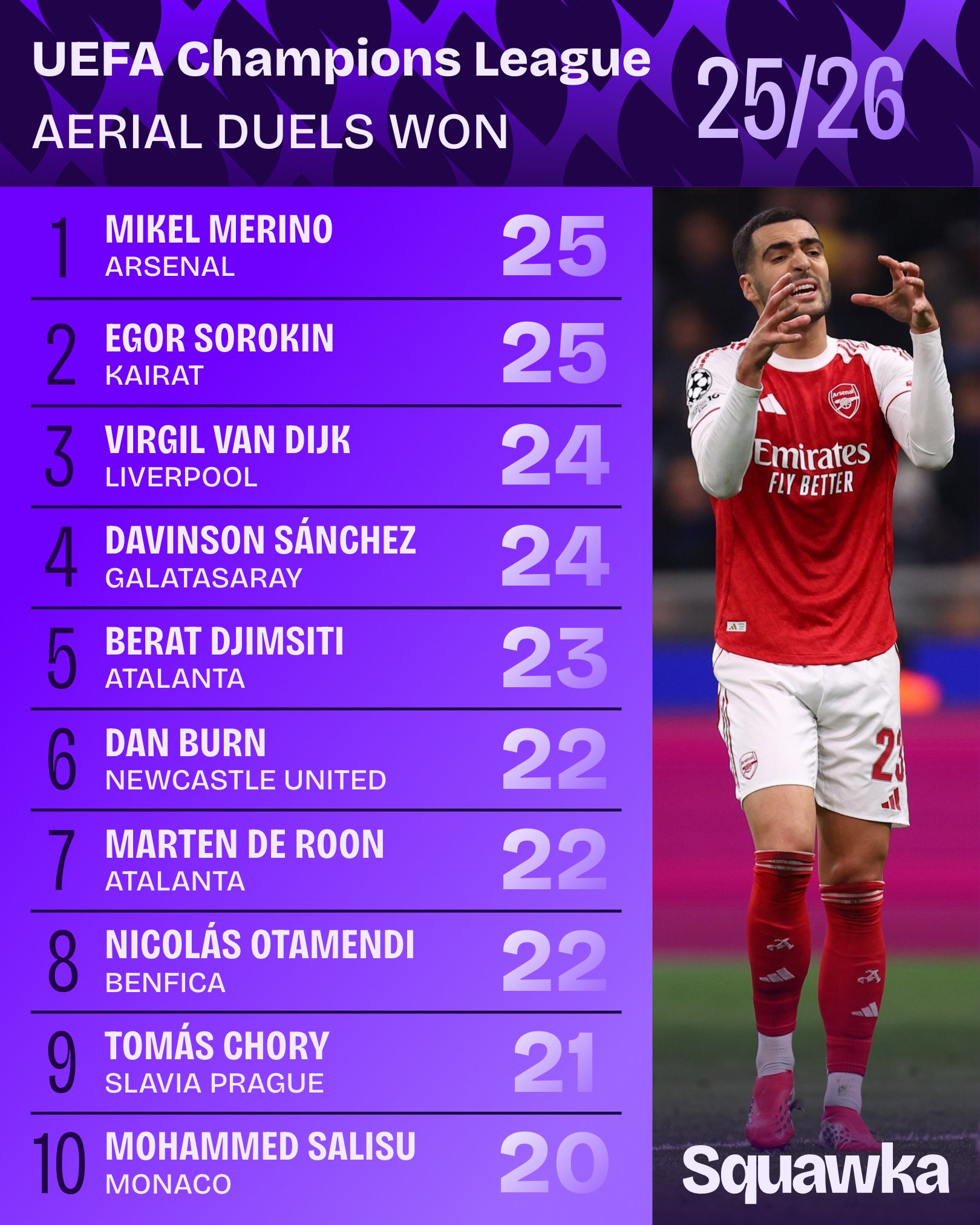 Squawka本赛季欧冠空中对抗成功排名:梅里诺、索罗金领衔