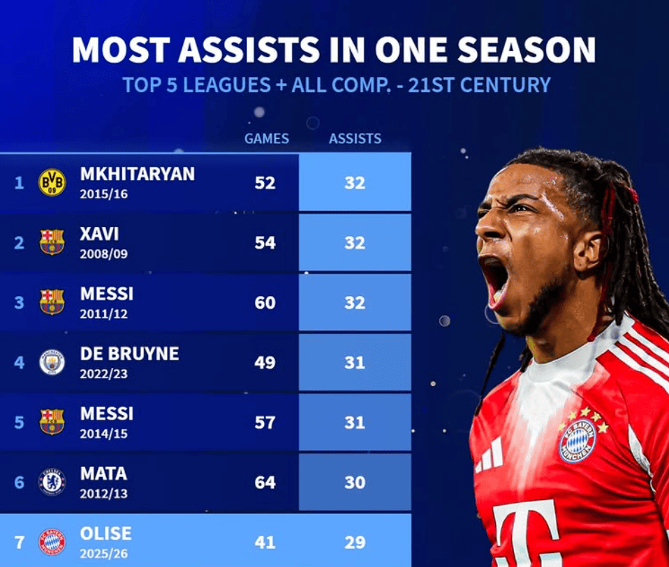 本世纪五大联赛球员单季各赛事助攻榜:奥利塞距榜首仅差3助