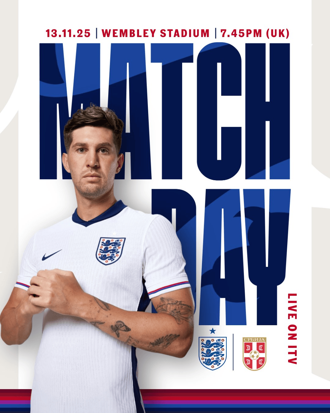 英格兰发布对阵塞尔维亚赛前海报,斯通斯单人出镜