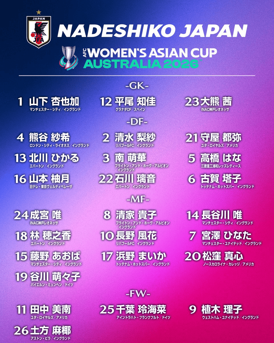 日本女足亚洲杯26人大名单:仅3名球员效力日本本土联赛