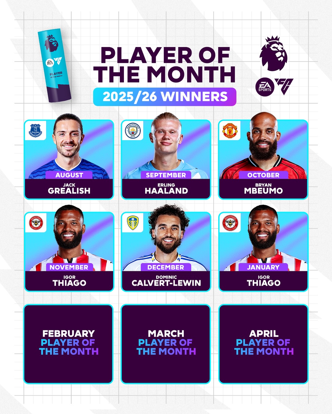 英超官方回顾本赛季月最佳球员得主:伊戈尔-蒂亚戈两度当选